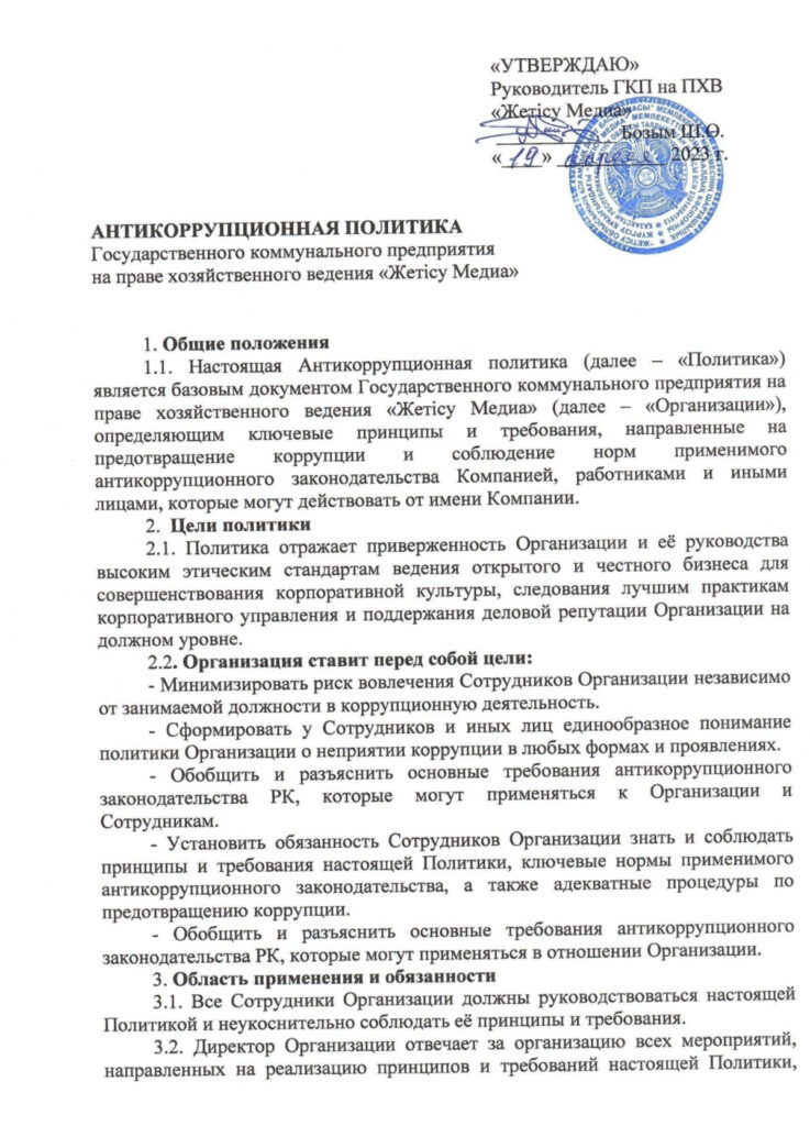 АНТИКОРРУПЦИОННАЯ ПОЛИТИКА Государственного коммунального предприятия на праве хозяйственного ведения «Жетісу Медиа»