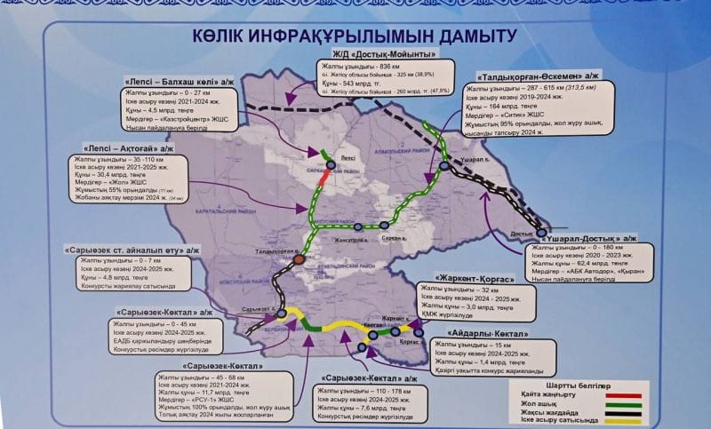 В этом году вводятся в эксплуатацию участки автодорог республиканского значения «Талдыкорган – Ушарал» (287-615 км) и «Сарыозек – Коктал» (45-68 км). Также полностью завершен ремонт автодороги «Лепсы-озеро Балхаш» (0-27 км). До конца года 90 км автомобильной дороги «Алматы-Усть-Каменогорск-Лепсы-Актогай» будут обеспечены асфальтовым покрытием, оставшиеся 15 км – до туристического сезона 2025 года. План на текущий год – ремонт 182 км дорог областного значения и внутренних улиц 54 населенных пунктов.