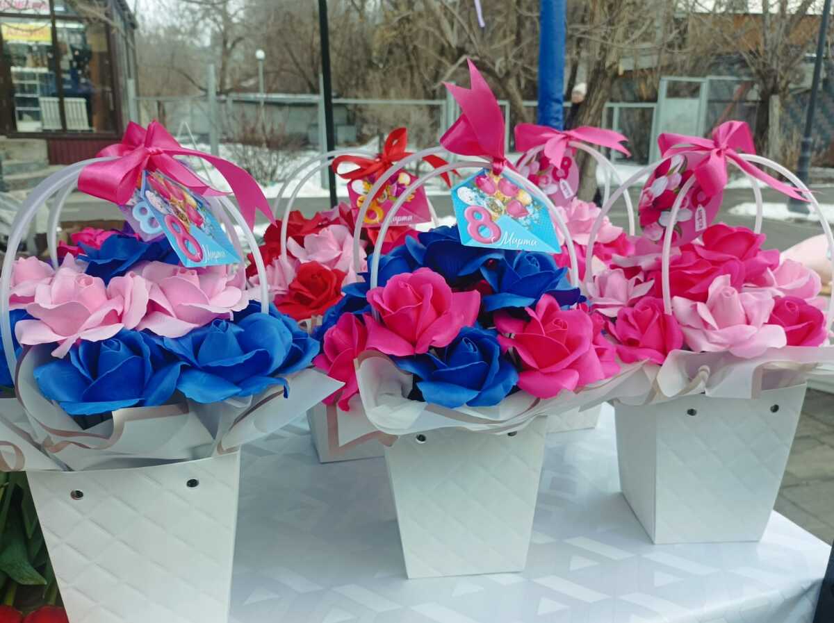 На Арбате в Талдыкоргане возле прилавков с прекраснейшими букетами, сделанными из мыла, больше покупателей, чем у столиков с живыми тюльпанами, передает корреспондент Vestnik19.kz