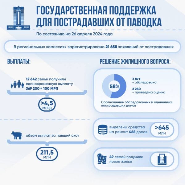 Государство оказывает всестороннюю помощь пострадавшим от паводков казахстанцам. На сегодняшний день более 12 000 семей получили единовременную выплату, 49 семей — новые дома и квартиры. Ведутся работы по ремонту жилья и возмещению ущерба за павший скот.