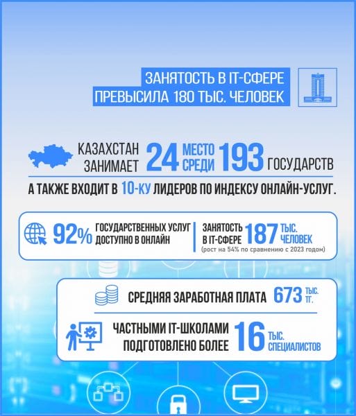 Среднемесячная заработная плата IT-специалистов в 2024 году увеличилась на 54%, достигнув 673 тыс. тенге, что отражает высокий спрос на квалифицированные кадры и конкурентоспособные условия труда. Занятость в IT-сфере увеличилась на 12% до 187 тыс. человек.