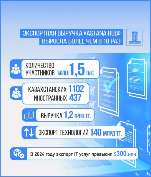 В 2024 году IT-отрасль Казахстана продемонстрировала динамичный рост. Количество IT-компаний достигло 18 683. Рост на 16% за последние три года. Так, например, в стране функционирует международный технологический парк «Astana Hub». Сегодня он подтверждает свою роль в качестве центра развития IT-стартапов в Казахстане. Технопарк объединил более 1,5 тыс. участников. Среди них 1102 казахстанских и 437 зарубежных компаний. Общая выручка участников составила 1,2 трлн тенге. Рост в 31 раз за последние пять лет. Экспортная выручка в текущем году превысила 140 млрд тенге. Годовой рост уже более чем в 10 раз за четыре года. Таким образом, «Astana Hub» продолжает укреплять свои позиции как ведущий технопарк в регионе.