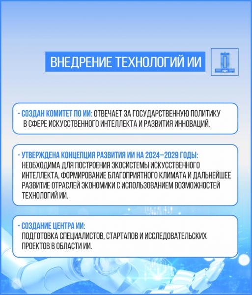 • разработан проект Закона об ИИ, что обеспечит необходимую нормативно-правовую базу для дальнейшего роста.