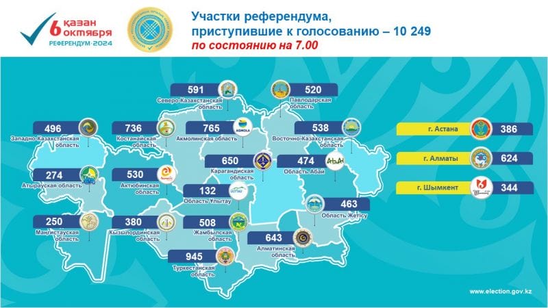 Сегодня, 6 октября 2024 года, в 7:00 утра все 10 249 избирательных участков по всей стране приступили к голосованию на референдуме о строительстве атомной электростанции. В списки избирателей включено более 12 миллионов граждан, из которых 10 623 человека воспользовались открепительными удостоверениями для голосования в других участках, сообщает Vestnik19.kz со ссылкой на пресс-службу Центральной избирательной комиссии РК.