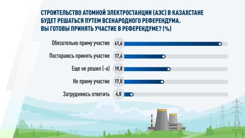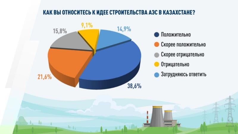 В целом 60,2% казахстанцев положительно относятся к идее строительства АЭС в Казахстане. Из них 38,6% – положительно, 21,6% – скорее положительно. По сравнению с предыдущим опросом, проведенным в августе, число сторонников идеи строительства АЭС выросло с 53,1 до 60,2%.