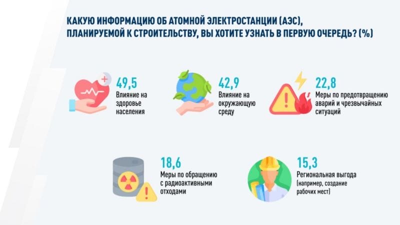 Так, на вопрос «Какую информацию об атомной электростанции (АЭС), планируемой к строительству, Вы хотите узнать в первую очередь?» 49,5% отметили «влияние на здоровье населения», 42,9% – «влияние на окружающую среду». Еще 22,8% респондентов выбрали вариант ответа «меры по предотвращению аварий и чрезвычайных ситуаций».