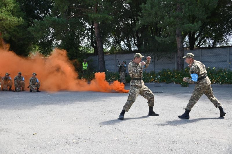 Но медики также успешно выполнили свои задачи. Нападения террористов были отражены с захватом их в плен. Первый этап тактико-специального учения «Қалқан-2024» был проведен слаженно, зрелищно. Далее представители воинской части 99285 бригады территориальной обороны области Жетісу продемонстрировали владение армейским рукопашным боем, состоящего из ударной техники руками, ногами, головой, а также борцовских, болевых приёмов.