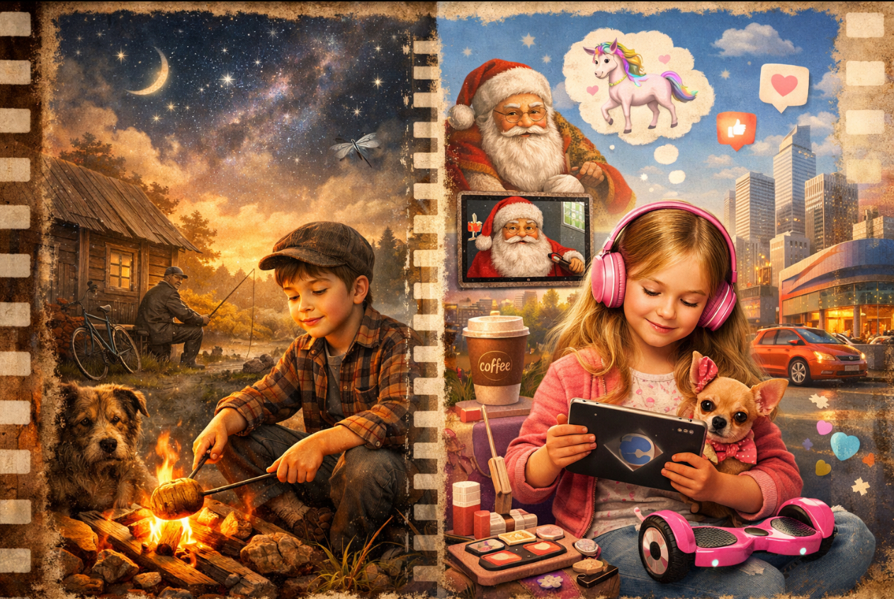 Когда я вижу, как дочь обижается на Деда Мороза, а сын тихо смеется, не вмешиваясь, мне кажется, что между ними — вся история нашей страны. От самодельных санок из досок до гироскутеров. От дефицита и нехватки средств до изобилия выбора, которое давно перестало быть счастьем.
