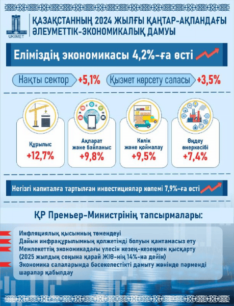 Экономика страны демонстрирует динамичный рост в 2024 году. По итогам января-февраля ВВП страны увеличился на 4,2%. При этом реальный сектор экономики вырос на 5,1%, а сфера услуг – на 3,5%.