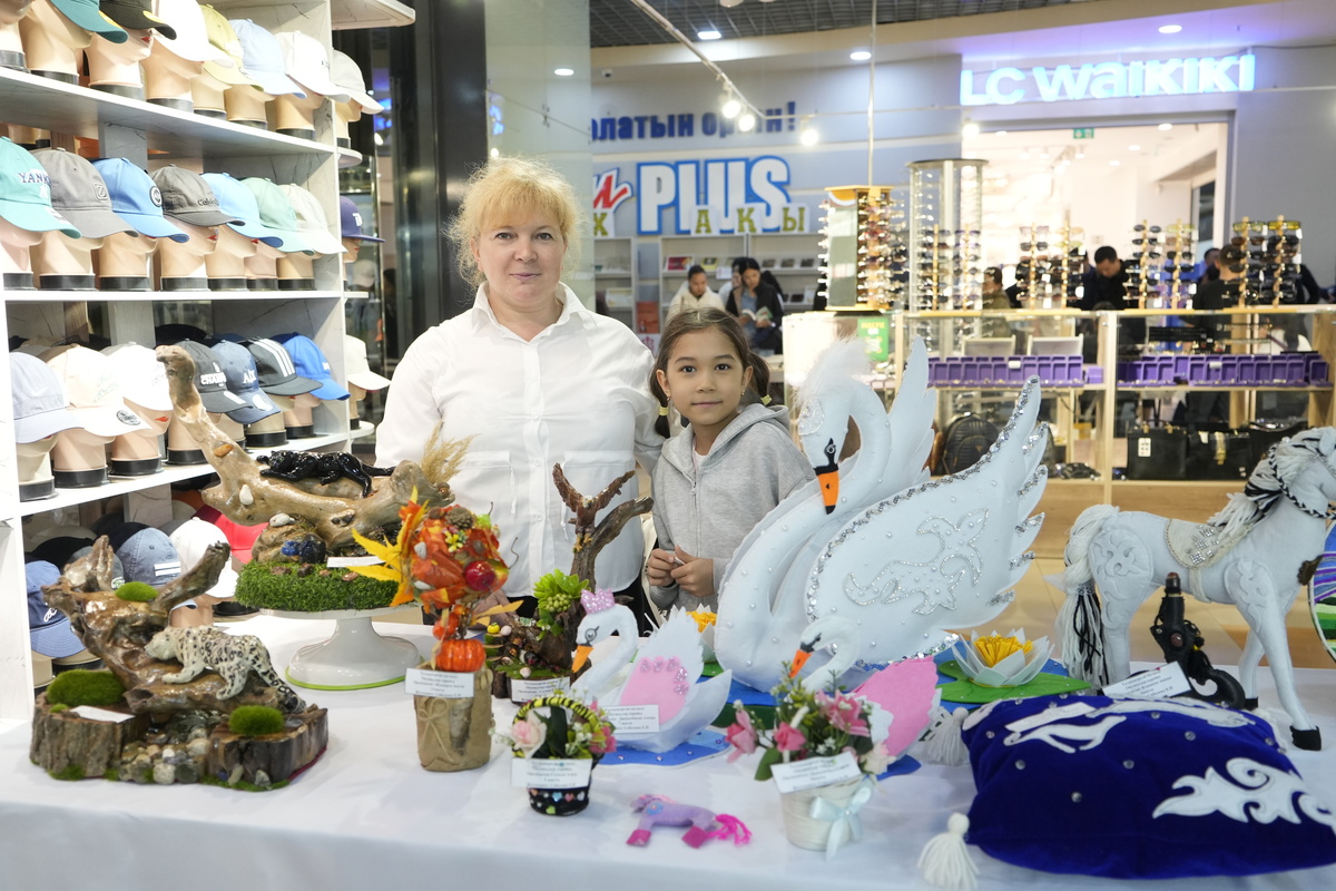 — Все эти работы сделаны детьми из подручных материалов, — рассказывает руководитель кружка «Қолөнер» Дворца школьников Евгения Соболева. — Мы стараемся показать, что творчество доступно каждому.