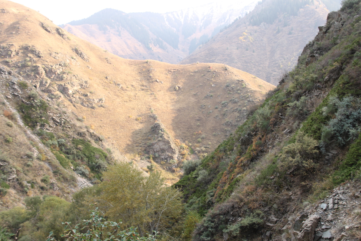 Сентябрьское утро Алматы вознаградило нас солнечной погодой и осенним теплом, идеально подходящими для такой поездки. Через полтора-два часа наш микроавтобус неспешно передвигался по серпантину, постепенно поднимаясь все выше и выше. Оставалось лишь молча любоваться склонами гор, поросших деревьями, листья которых уже слегка позолотила наступившая осень. И вот она – первая остановка.