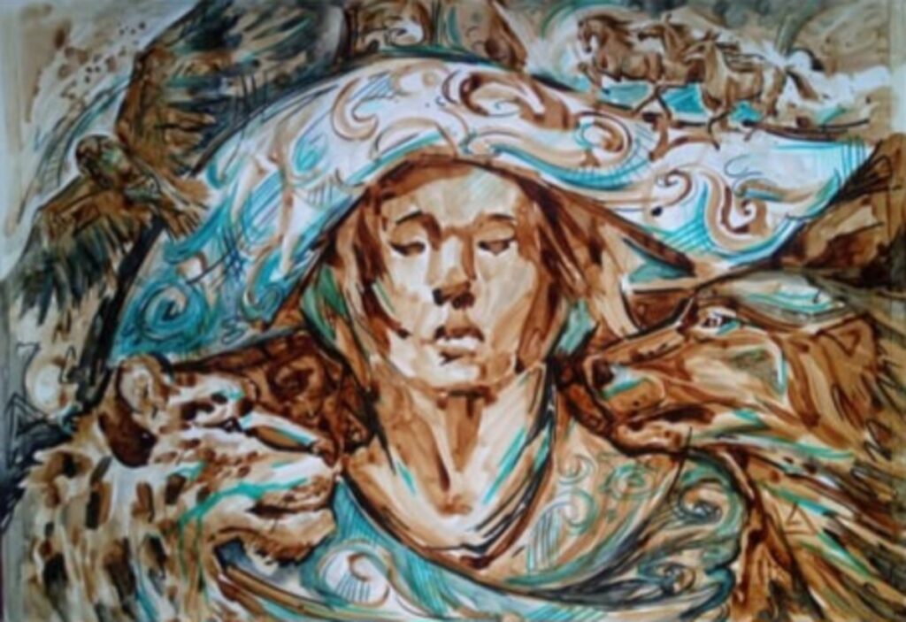 Картина, выполненная в кофейной технике, изображает юношу в традиционном национальном одеянии, окруженного животными Казахстана, символизируя преемственность поколений, связь истории и будущего. Работа отличается динамикой, глубиной цветовых решений и философским содержанием. Это произведение вошло в фонд Уилского районного музея искусств и истории края имени Ш. Берсиева.