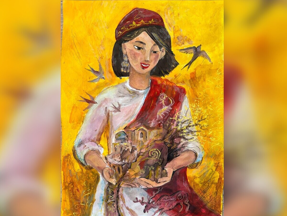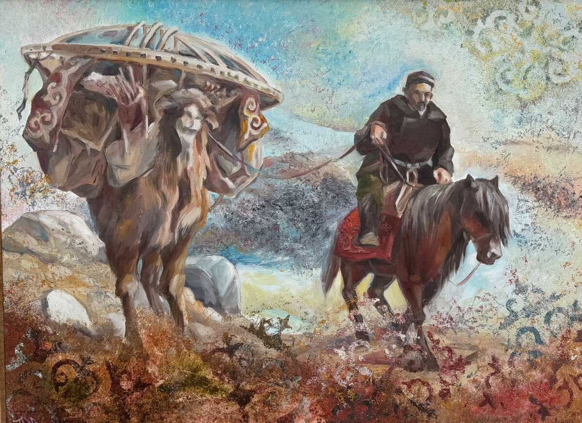 В картине «Кочевник» художница использует приемы живописного письма с наложением национальных орнаментов, создавая выразительную фактуру. Это смешение графики и живописи — еще одна грань ее поиска новых технических приемов.
