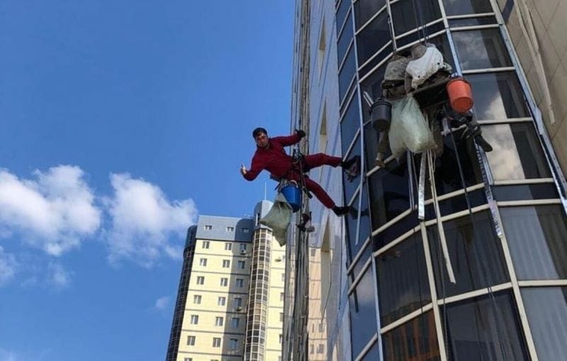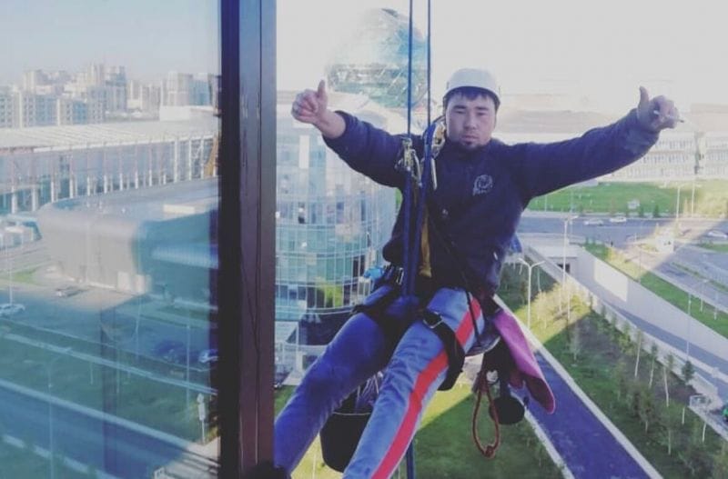Ринат родом из Тараза и уже 14 лет работает в этой непростой профессии. За это время он научился выполнять сложные задачи на значительных высотах, что позволяет ему обеспечивать свою семью. Его труд включает в себя мойку окон в высотных зданиях, таких как знаменитый «Байтерек», а также работы на множестве других сооружений высотой более 40-50 метров.