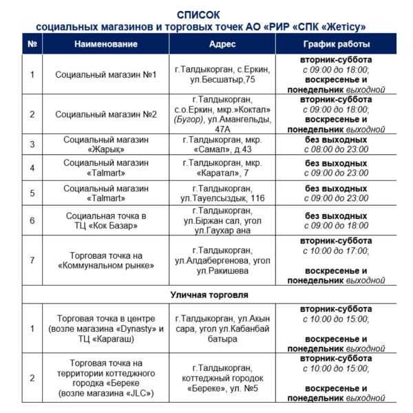 В частности, в Талдыкоргане действует 7 стационарных социальных точек, включая 5 социальных магазинов, а теперь для удобства населения к ним добавляют еще 5 объектов уличной торговли.