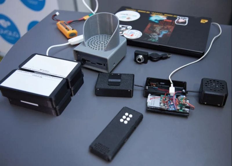 Третий проект, продемонстрированный на конкурсе, был Автоматический распознаватель денежных купюр. Он представляет собой небольшую коробочку, прикрепляемую на поясной ремень, с микрокомпьютером Raspberry Pi и развернутой на ней ИИ, и небольшую камеру, прикрепленную в области груди.