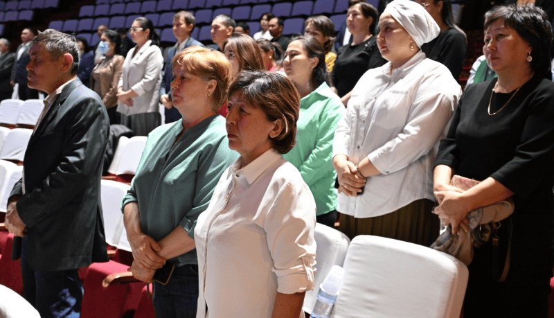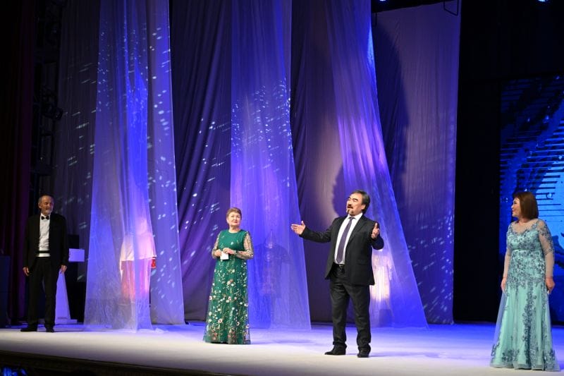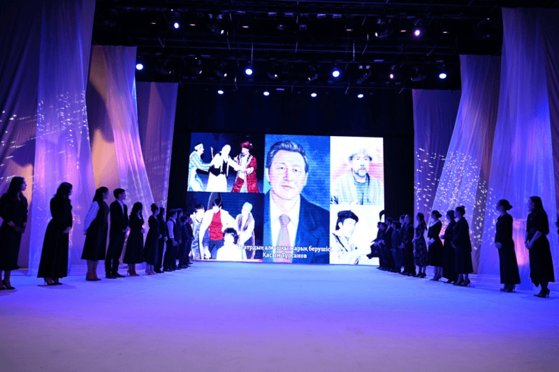 Торжественная концертная программа открылась вступительной речью актеров и памятным видеорядом о жизни и деятельности мэтров театра. Минутой молчания почтили память известных деятелей и артистов казахстанского театрального искусства.