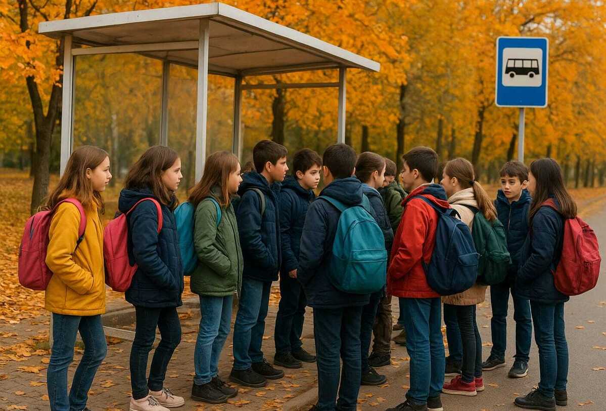 Школьники после учебы толпятся на остановке и в ожидании автобуса играют, балуются, выбегают на проезжую часть, рискуя попасть под колеса автомашин. Благо рядом находятся несколько взрослых, которые удерживают ребятню, буквально отталкивая от дороги, а где и окриком привлекая их внимание.