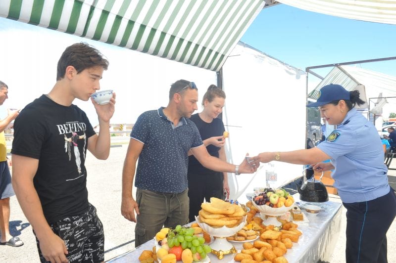 На 252 км автомобильной дороги Алматы – Оскемен сегодня, 14 июня, наблюдалась необычная картина. Сотрудники полиции угощали водителей и пассажиров транспорта чаем, кофе, баурсаками и другими блюдами казахской национальной кухни. А после приема пищи среди детей участников акции проводился опрос на знание ПДД, в ходе которого им за правильные ответы дарили детские автокресла. Так гостеприимно, радушно принимали участников республиканской акции «Приемная на дороге», передает корреспондент Vestnik19.kz