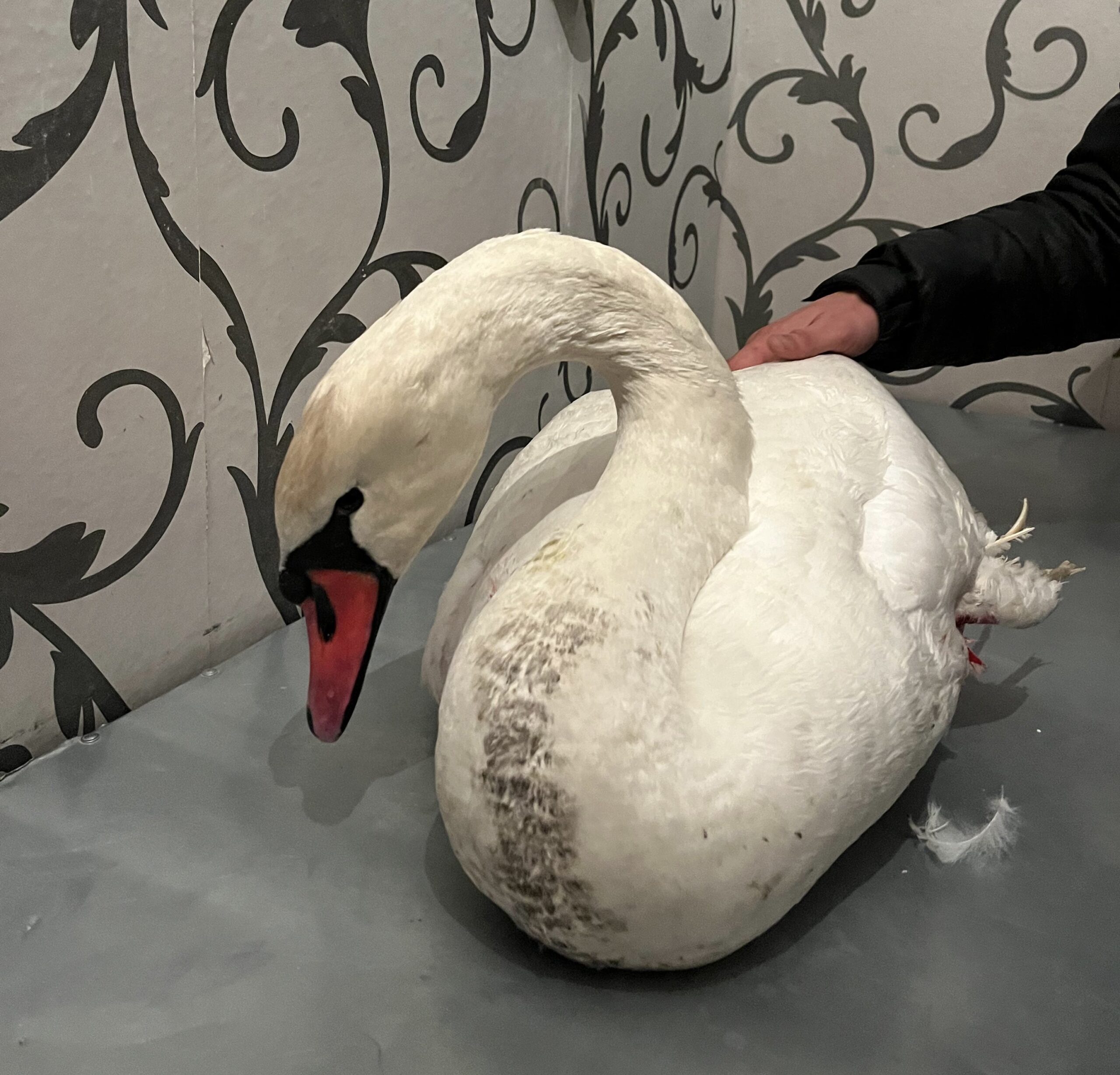 После осмотра выяснилось, что у белого лебедя перелом левого крыла. Сейчас он находится под наблюдением специалистов и получает необходимую помощь.