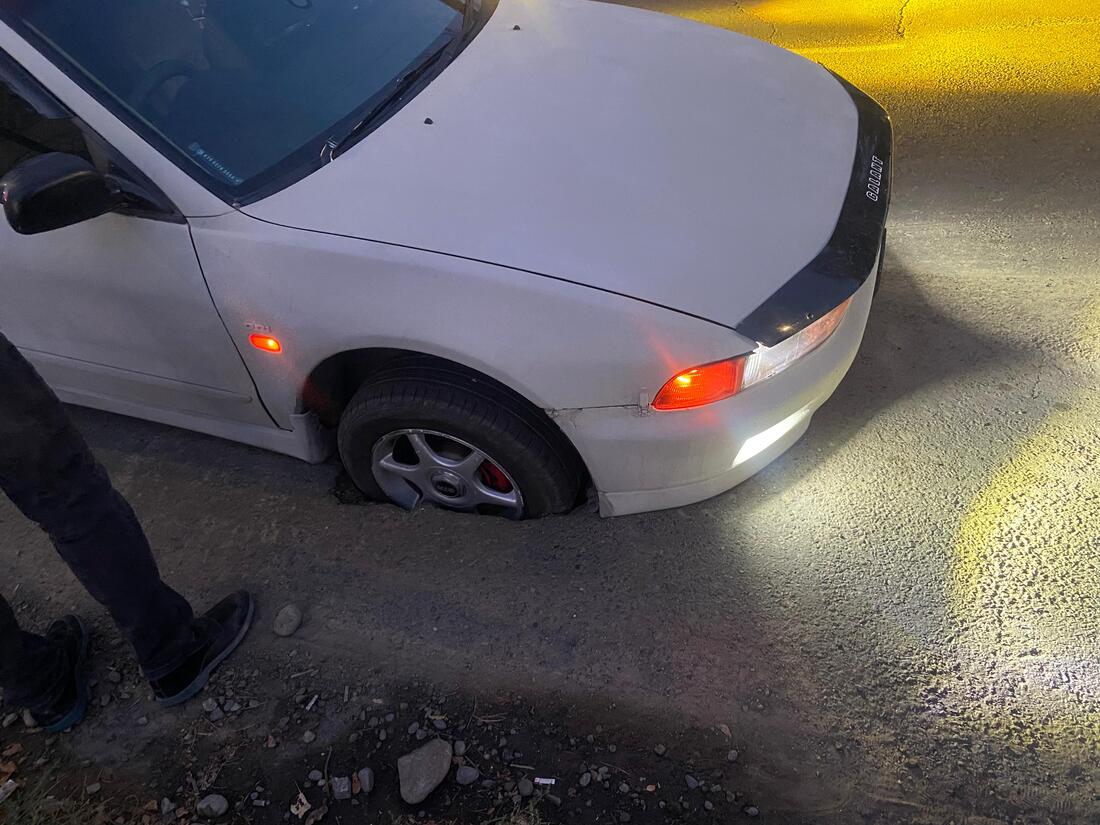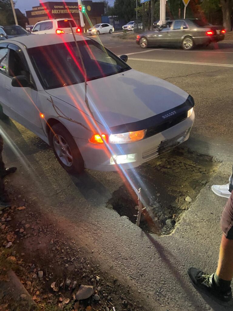 Автомобиль провалился в яму на проезжей части в Талдыкоргане