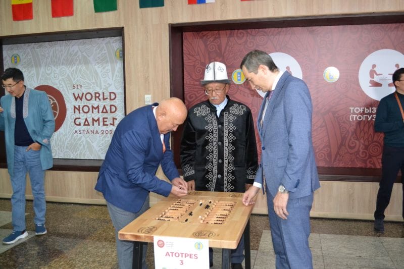 «Более 150 тысяч человек с 09:00 до 21:00 в школах, университетах, колледжах и на рабочих местах участники играют в блиц-формате тоғызқұмалақ, используя свои доски. И в честь проведения V Всемирных игр кочевников, федерации тоғызқұмалақ запустила в космосе набор интеллектуальной игры тоғызқұмалақ. Кстати, это единственная настольная игра, которая побывала в космосе», — сказал Алихан Байменов.