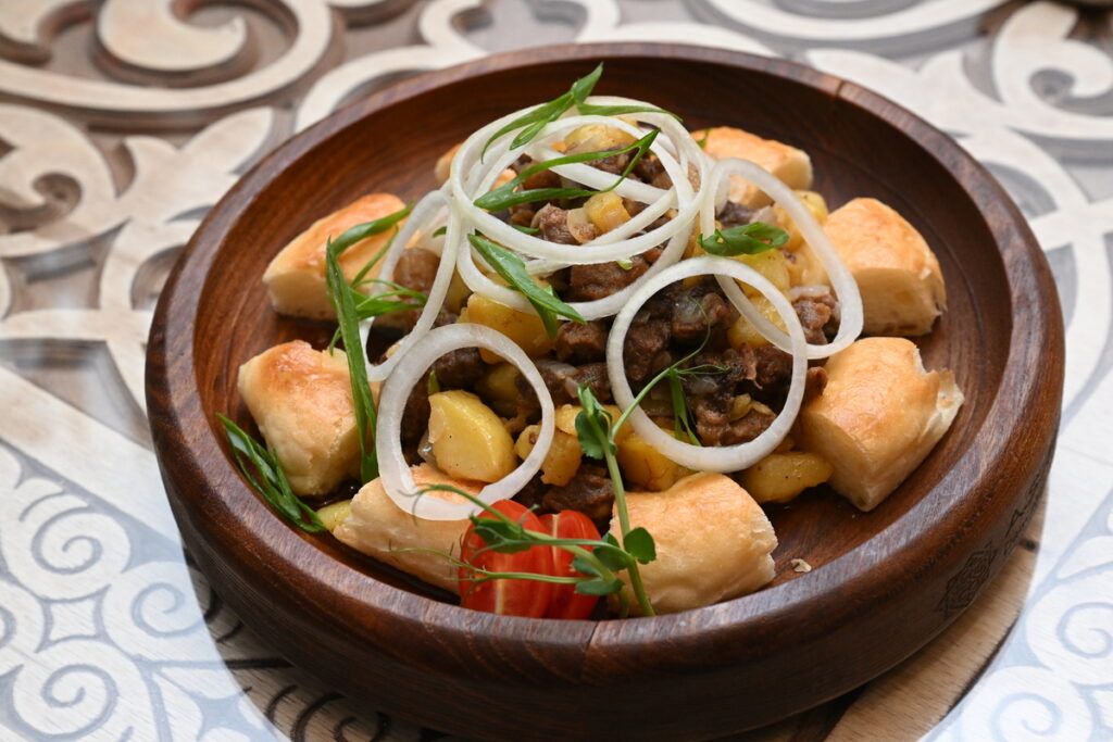 Из казахских блюд наибольшей популярностью пользуются тай куырдак, бешбармак и сырне. Еще одной «фишкой», которую часто выбирают посетители, является «ет-салма с қазы» — блюдо, которое обязательно подается в тандырной лепешке с кумысом и сорпой. На наш вопрос о подаче спиртных напитков администратор ответил, что в халяльном заведении такое не практикуют.